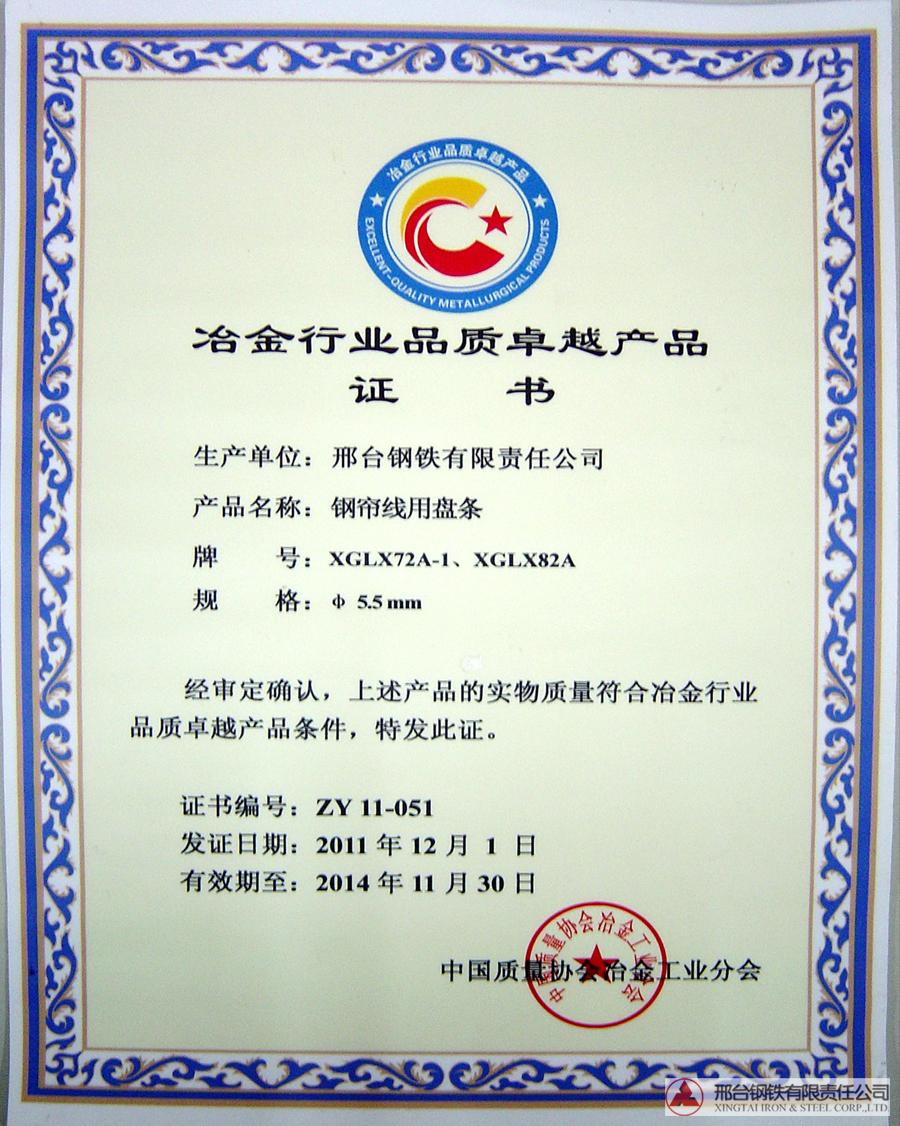 The φ5.5mm wire XGLX72A-1, XGLX82A-1 for tire cord awarded the superior quality product of Metallurgy Industry.