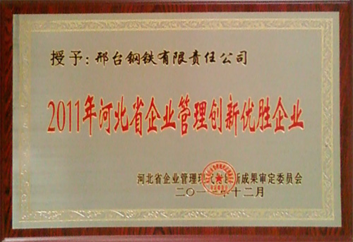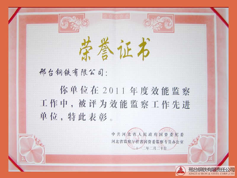 Xingtai Steel was awarded the Efficiency Supervision Advanced Unit of 2011which issued by Committee for Disciplinary Inspection of HBSA and the Office in HBSA of the Ombudsman of The Department of supervision of Hebei Province