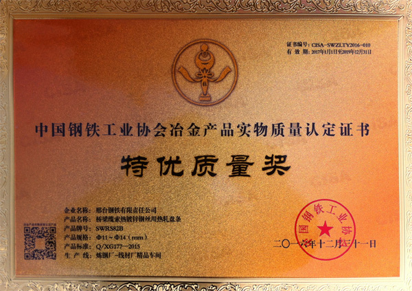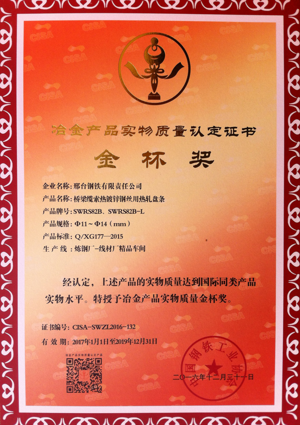 橋梁纜索熱鍍鋅鋼絲用熱軋盤條SWRS82B、SWRS82B-L Φ11~Φ14(mm)獲得冶金產(chǎn)品實(shí)物質(zhì)量“金杯獎(jiǎng)”