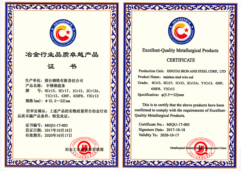 不銹鋼盤條0Cr13、0Cr17、1Cr13、2Cr13A、Y1Cr13、430F、430FR、Y3Cr13共8個(gè)牌號(hào)φ5.5- 32mm規(guī)格獲冶金行業(yè)品質(zhì)卓越產(chǎn)品