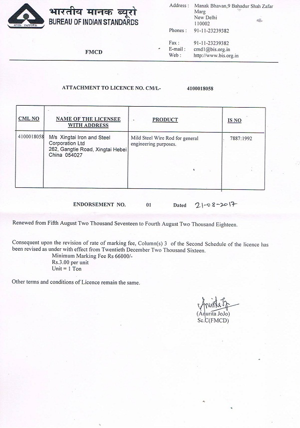 邢鋼申請(qǐng)印度BIS認(rèn)證的6個(gè)產(chǎn)品牌號(hào)(對(duì)應(yīng)邢鋼49個(gè)產(chǎn)品牌號(hào))通過印度國(guó)家認(rèn)證