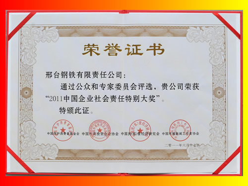 2011年6月17日,邢鋼被評選為“2011中國企業(yè)社會(huì)責(zé)任特別大獎(jiǎng)”。