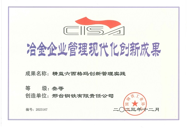 2023年12月,邢鋼《精益六西格瑪創(chuàng)新管理實(shí)踐》獲第二十一屆(2023年)冶金企業(yè)管理現(xiàn)代化創(chuàng)新成果獎。