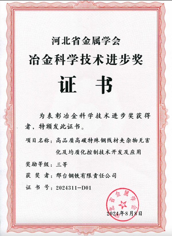 2024年8月8日,《高品質(zhì)高碳特殊鋼線材夾雜物無害化及均質(zhì)化控制技術(shù)開發(fā)及應(yīng)用》項(xiàng)目榮獲河北省冶金科學(xué)技術(shù)進(jìn)步獎三等獎。