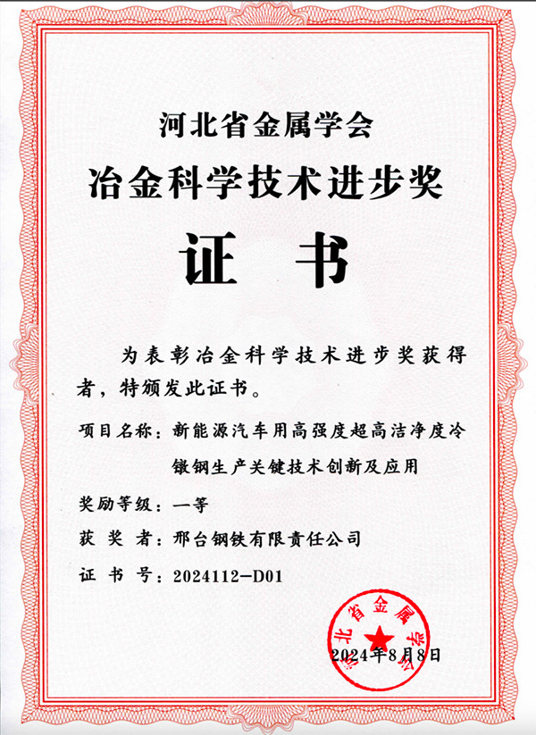 2024年8月8日,邢鋼《新能源汽車用高強(qiáng)度超高潔凈度冷鐓鋼生產(chǎn)關(guān)鍵技術(shù)創(chuàng)新及應(yīng)用》項(xiàng)目榮獲河北省冶金科學(xué)技術(shù)進(jìn)步獎一等獎。