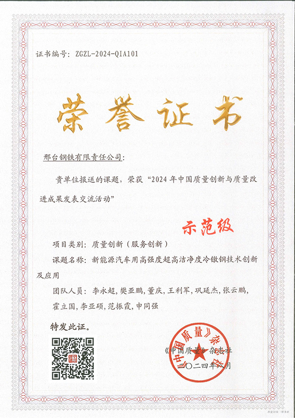 2024年8月,邢鋼《新能源汽車用高強(qiáng)度超高潔凈度冷鐓鋼技術(shù)創(chuàng)新及應(yīng)用》課題榮獲“2024年中國質(zhì)量創(chuàng)新與質(zhì)量改進(jìn)成果發(fā)表交流活動”最高級別的“示范級”榮譽(yù)。