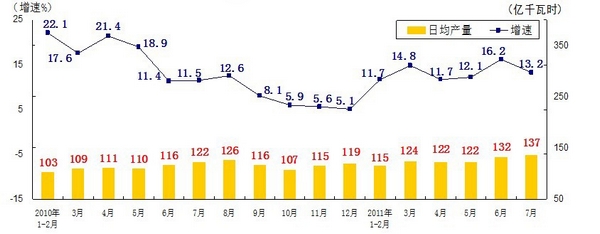 分產(chǎn)品看,7月份,468種產(chǎn)品中有381種產(chǎn)品同比增長。其中,發(fā)電量4252億千瓦時,日平均發(fā)電量137億千瓦時,增長13.2%;鋼材7572萬噸,日平均產(chǎn)量244萬噸,增長14.9%;水泥18308萬噸,日平均產(chǎn)量591萬噸,增長16.8%;原油加工量3749萬噸,日平均產(chǎn)量121萬噸,增長5.9%;十種有色金屬293萬噸,日平均產(chǎn)量9.5萬噸,增長9.8%;乙烯130萬噸,日平均產(chǎn)量4.2萬噸,增長11.5%;汽車131.8萬輛,日平均產(chǎn)量4.3萬輛,下降1.3%;轎車77.7萬輛,日平均產(chǎn)量2.5萬輛,增長12.6%。(參見附圖)