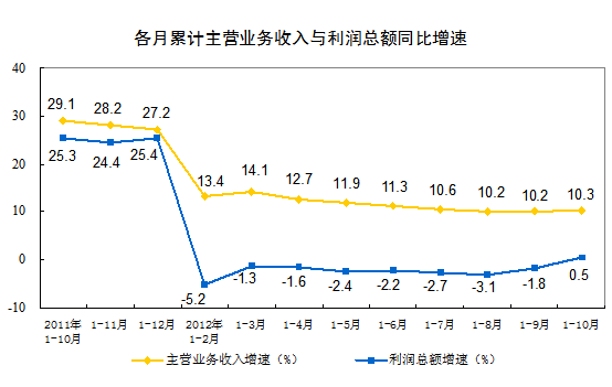 1-10月份全國(guó)規(guī)模以上工業(yè)企業(yè)實(shí)現(xiàn)利潤(rùn)同比增長(zhǎng)0.5%
