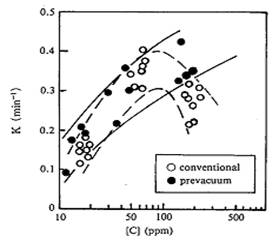 新日鐵名古屋廠的實(shí)踐證實(shí),預(yù)抽真空可以消除初始階段脫碳速率的滯止,使脫碳速率在RH開始處理后迅速達(dá)到高的水平,如下圖所示。預(yù)抽真空循環(huán)開始的時間要比沒有預(yù)抽縮短0.5min。