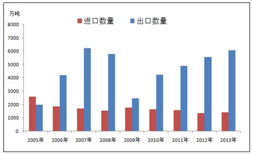 近幾年,中國鋼鐵的進(jìn)口很穩(wěn)定波動不大,出口處于穩(wěn)健增長狀態(tài)。出口量增加的原因一是因?yàn)榻?jīng)濟(jì)危機(jī)后各國經(jīng)濟(jì)都在緩慢復(fù)蘇中,主要經(jīng)濟(jì)體制造業(yè)景氣表現(xiàn)出現(xiàn)回升,2014年上半年全球制造業(yè)PMI指數(shù)平均值為52.58,達(dá)到了近兩年來相對高位的水平。另外新興經(jīng)濟(jì)體對國家基礎(chǔ)設(shè)施建設(shè)和民用建筑的投資不斷增大,對鋼材的需求明顯增加;二是中國鋼材價格相較于其他出口國較為低廉,且近期鋼價仍在不斷下跌,這增強(qiáng)了中國鋼材在國際貿(mào)易市場上的競爭力。2014年上半年,中國出口量為3930.37萬噸,同比增加1038.37萬噸,同比增幅為35.9%。(見圖2)