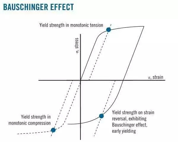 金屬材料經(jīng)過(guò)預(yù)先加載產(chǎn)生少量塑性變形(殘余應(yīng)變?yōu)?%~2%),卸載后再同向加載,規(guī)定殘余應(yīng)力(彈性極限或屈服強(qiáng)度 )增加;反向加載,規(guī)定殘余應(yīng)力降低(特別是彈性極限在反向加載時(shí)幾乎降低到零)的現(xiàn)象,稱為包申格效應(yīng)。