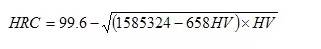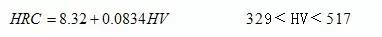 此公式用我國公布的黑色金屬硬度標(biāo)準(zhǔn)數(shù)據(jù)進(jìn)行換算,其HRC誤差基本上在?0.4HRC 范圍內(nèi),其最大誤差也僅士0.9HRC,計(jì)算的HV誤差最大為?15HV。