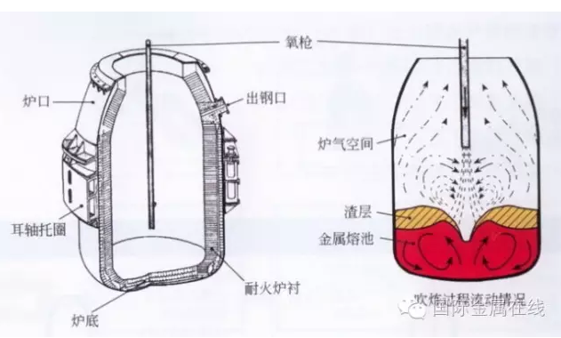 爐料通常為鐵水、廢鋼和造渣材料;也可加入少量冷生鐵和鐵礦石。通過氧槍從熔池上面向下吹入高壓的純氧(含O299.5%以上),氧化去除鐵水中的硅、錳、碳和磷等元素,并通過造渣進行脫磷和脫硫。各種元素氧化所產(chǎn)生的熱量,加熱了熔池的液態(tài)金屬,使鋼水達到現(xiàn)定的化學(xué)成分和溫度。它主要用于冶煉非合金鋼和低合金鋼;但通過精煉手段,也可用于冶煉不銹鋼等合金鋼。