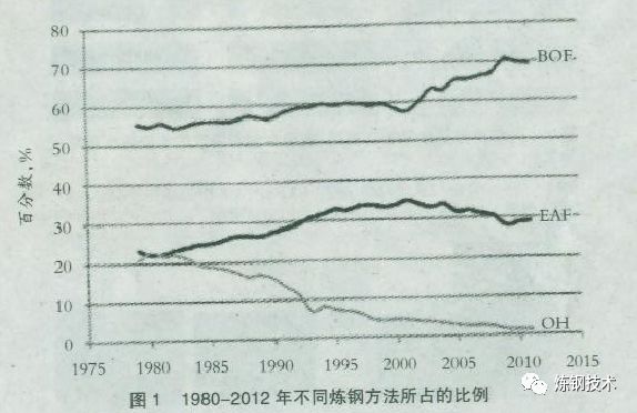 自此,氧氣轉(zhuǎn)爐煉鋼得到快速發(fā)展,而平爐煉鋼開始下降,如圖1所示。氧氣轉(zhuǎn)爐煉鋼發(fā)展超過平爐煉鋼的一個重要因素是連鑄技術(shù)的引進。連鑄要求鋼水源源不斷供應(yīng),而氧氣轉(zhuǎn)爐的工藝時間比較短,能很容易地滿足連鑄的鋼水供應(yīng),一個大轉(zhuǎn)爐(350t)的產(chǎn)鋼速度為500t/h。與此相對照,如果平爐常規(guī)操作,煉鋼至出鋼需要12—14h,或者如果借助工業(yè)用氧加速也需要7—8h。目前在烏克蘭、俄羅斯和印度仍然存在一定數(shù)量的平爐冶煉。這些爐子正逐步被電弧爐取代,2012年平爐工藝總產(chǎn)鋼量1690萬t,約占全球鋼產(chǎn)量的1.1%。