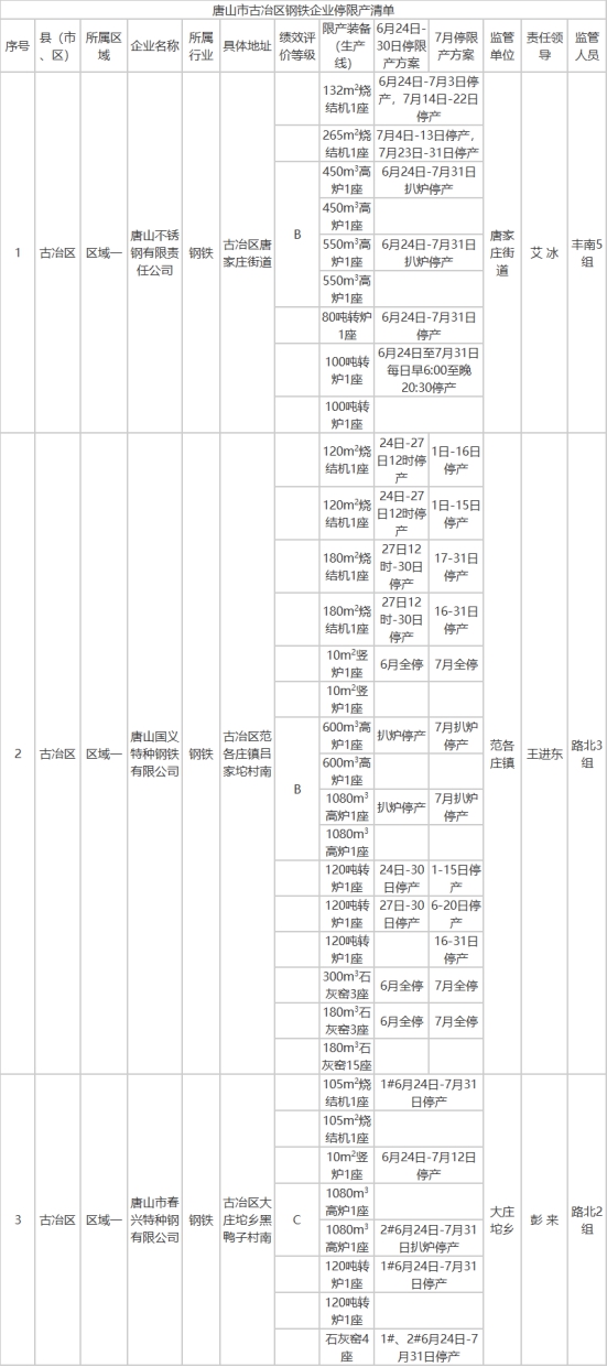 唐山市古冶區(qū)鋼鐵企業(yè)停限產(chǎn)清單