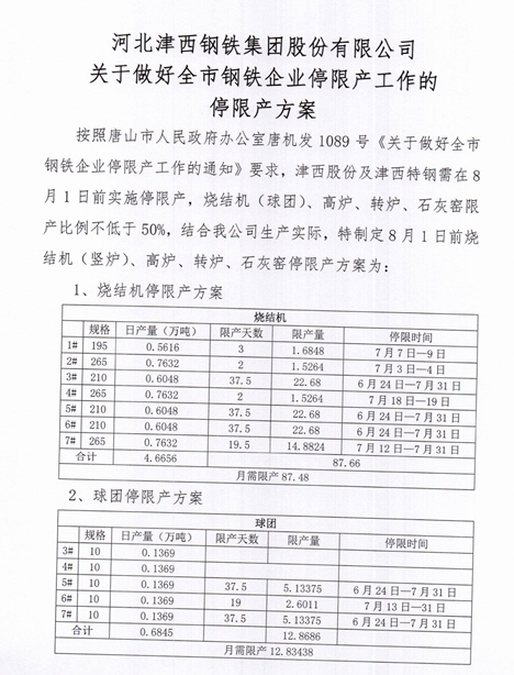 根據(jù)唐山市人民政府辦公室下發(fā)的文件《關(guān)于做好全市鋼鐵企業(yè)停限產(chǎn)的通知》要求:“全市鋼鐵企業(yè)燒結(jié)機(jī)(球團(tuán))、轉(zhuǎn)爐、白灰窯限產(chǎn)比例不低于50%,且接到本通知起立即停產(chǎn)到位,高爐于6月27日前停產(chǎn)到位。”我縣(灤南縣)兩家鋼鐵企業(yè)制定并執(zhí)行以下管控措施: