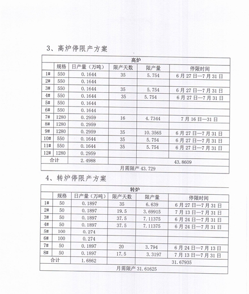 1、高爐限產(chǎn)50%,6月25日0時(shí)—7月12日12時(shí)停產(chǎn),7月12日12時(shí)—7月31日正常生產(chǎn),共停機(jī)17.5天。