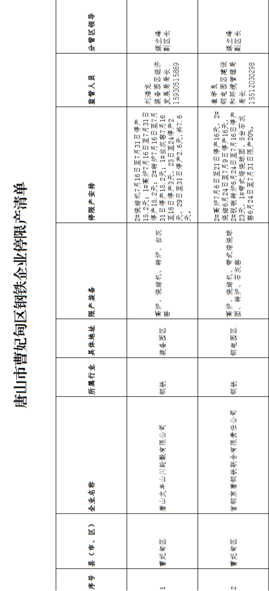 唐山市曹妃甸區(qū)鋼鐵企業(yè)停限產(chǎn)清單