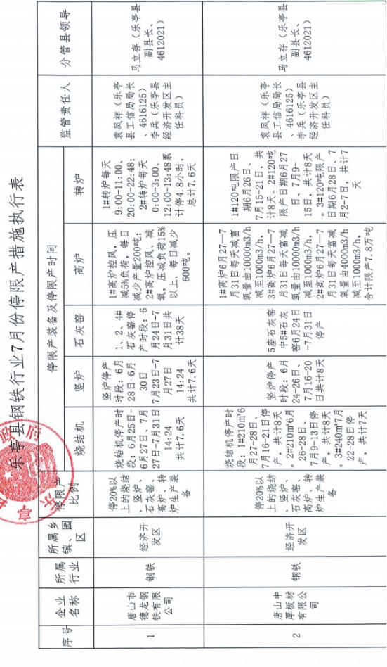 唐山樂(lè)亭縣鋼鐵企業(yè)7月份停限產(chǎn)措施執(zhí)行表