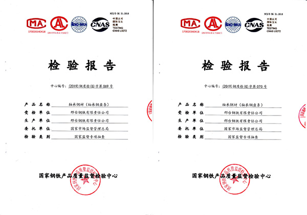受國家市場監(jiān)督管理總局委托,2019年11月國家鋼鐵產(chǎn)品質(zhì)量監(jiān)督檢驗(yàn)中心對(duì)邢鋼高碳鉻軸承鋼進(jìn)行了監(jiān)督抽查,判定依據(jù)為《2019年軸承鋼材產(chǎn)品質(zhì)量國家監(jiān)督專項(xiàng)抽查方案》,現(xiàn)場抽取了2個(gè)批次盤條,近日公司收到檢測報(bào)告2個(gè),結(jié)論為:所檢項(xiàng)目符合GB/T18254-2016《高碳鉻軸承鋼》標(biāo)準(zhǔn)及抽樣方案,判定合格,報(bào)告中顯示,7大項(xiàng)29個(gè)項(xiàng)目結(jié)果全部高于該產(chǎn)品標(biāo)準(zhǔn),達(dá)到了高級(jí)優(yōu)質(zhì)鋼級(jí)別水平。