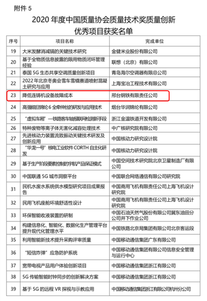 本次評(píng)選是為深入落實(shí)新時(shí)代高質(zhì)量發(fā)展要求,推動(dòng)我國(guó)質(zhì)量技術(shù)進(jìn)步,提高質(zhì)量創(chuàng)新和競(jìng)爭(zhēng)能力,根據(jù)《國(guó)家科學(xué)技術(shù)獎(jiǎng)勵(lì)條例》和《中國(guó)質(zhì)量協(xié)會(huì)質(zhì)量技術(shù)獎(jiǎng)管理辦法》有關(guān)規(guī)定,結(jié)合2020年度中國(guó)質(zhì)量協(xié)會(huì)技術(shù)獎(jiǎng)(以下簡(jiǎn)稱(chēng)質(zhì)量技術(shù)獎(jiǎng))單列優(yōu)秀項(xiàng)目成果申報(bào)情況,經(jīng)質(zhì)量技術(shù)獎(jiǎng)評(píng)審委員會(huì)評(píng)審,中國(guó)質(zhì)量協(xié)會(huì)批準(zhǔn)授予的。邢鋼公司獲獎(jiǎng)項(xiàng)目—《降低連鑄機(jī)設(shè)備故障成本》為質(zhì)量創(chuàng)新類(lèi)別單列優(yōu)秀項(xiàng)目成果。
