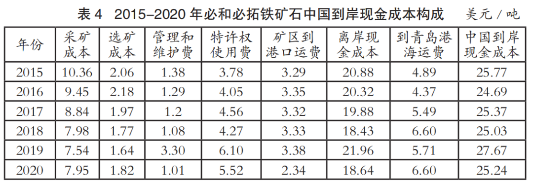 中國(guó)進(jìn)口鐵礦石到岸成本主要由離岸現(xiàn)金成本和海運(yùn)成本兩部分構(gòu)成。表1至表4為2015-2020年國(guó)際四大礦鐵礦石中國(guó)到岸現(xiàn)金成本構(gòu)成情況(數(shù)據(jù)來源:AME),其中離岸現(xiàn)金成本由采礦成本、選礦成本、管理和維護(hù)費(fèi)、特許權(quán)使用費(fèi)和礦區(qū)到港口運(yùn)費(fèi)構(gòu)成;中國(guó)到岸現(xiàn)金成本由離岸現(xiàn)金成本和到青島港海運(yùn)費(fèi)構(gòu)成;該成本數(shù)據(jù)僅為現(xiàn)金成本,不含國(guó)際四大礦的融資、折舊費(fèi)用。