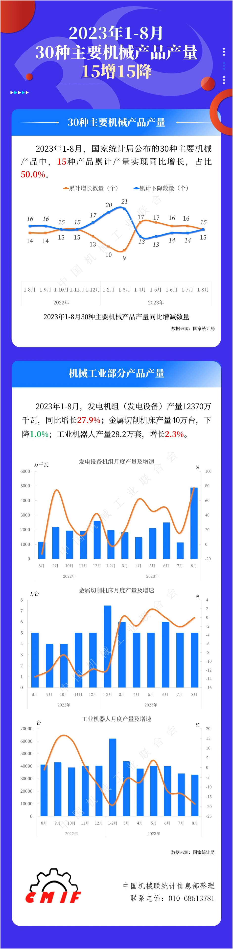 2023年1-8月,國家統(tǒng)計局公布的30種主要機械產(chǎn)品中,15種產(chǎn)品累計產(chǎn)量實現(xiàn)同比增長,占比50.0%。