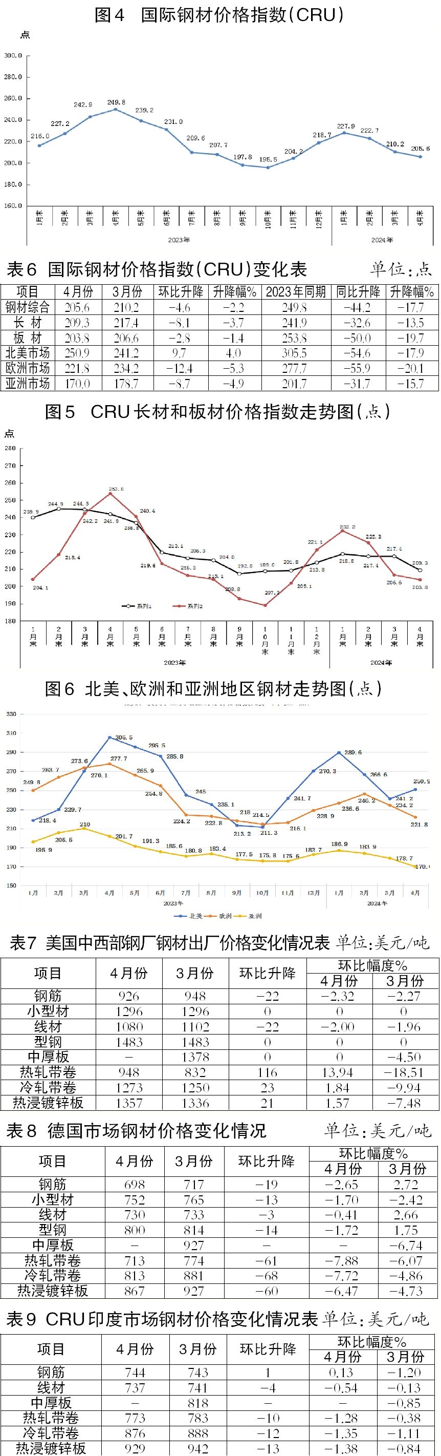1月—4月份,CRU國際鋼材價(jià)格指數(shù)平均值為216.6點(diǎn),同比下降17.4點(diǎn),降幅為7.4%。