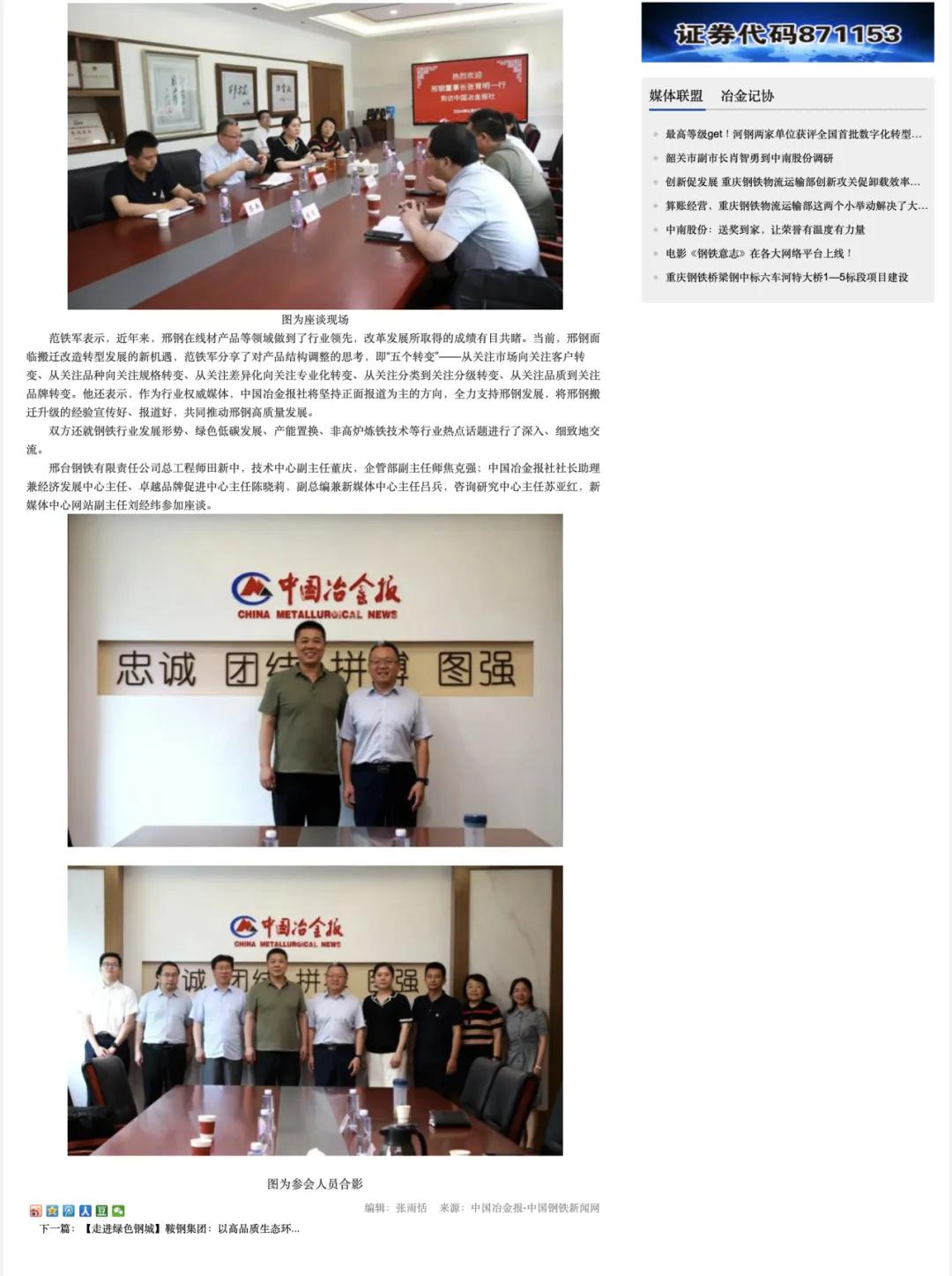 邢臺(tái)鋼鐵有限責(zé)任公司總工程師田新中,技術(shù)中心副主任董慶,企管部副主任師焦克強(qiáng);中國(guó)冶金報(bào)社社長(zhǎng)助理兼經(jīng)濟(jì)發(fā)展中心主任、卓越品牌促進(jìn)中心主任陳曉莉,副總編兼新媒體中心主任呂兵,咨詢研究中心主任蘇亞紅,新媒體中心網(wǎng)站副主任劉經(jīng)緯參加座談。