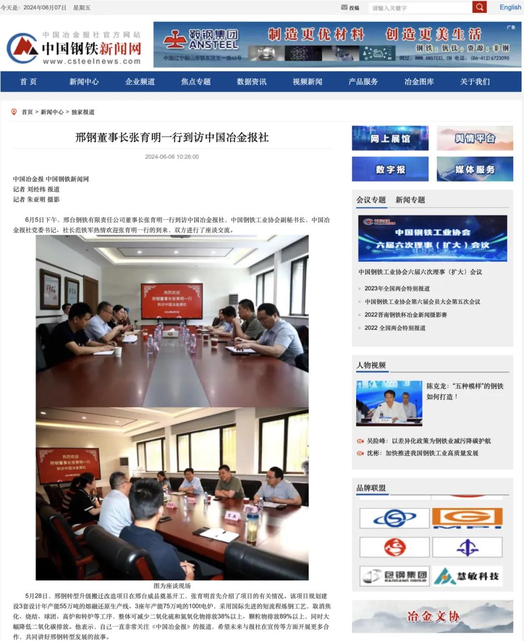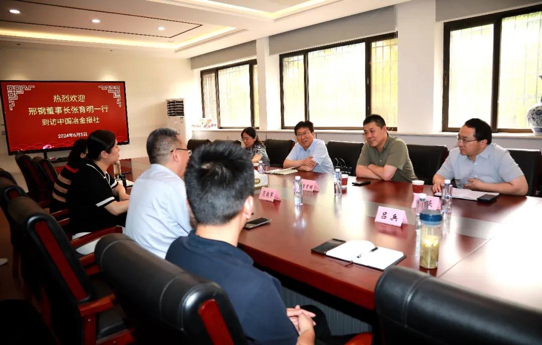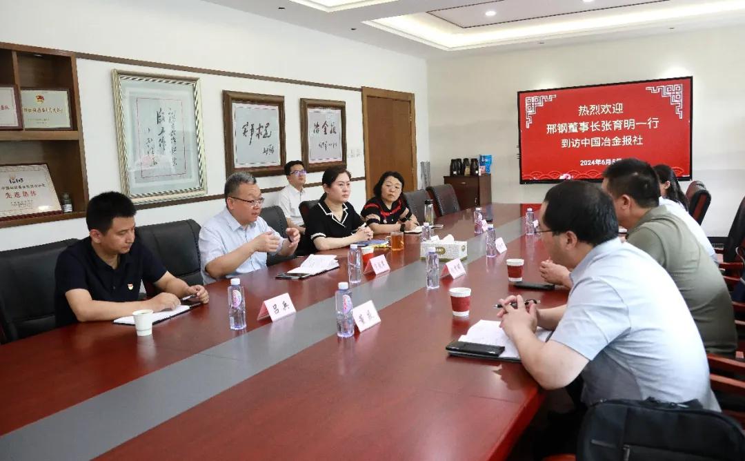 6月5日下午,邢臺(tái)鋼鐵有限責(zé)任公司董事長(zhǎng)張育明一行到訪中國(guó)冶金報(bào)社,中國(guó)鋼鐵工業(yè)協(xié)會(huì)副秘書長(zhǎng),中國(guó)冶金報(bào)社黨委書記、社長(zhǎng)范鐵軍熱情歡迎張育明一行的到來(lái),雙方進(jìn)行了座談交流。