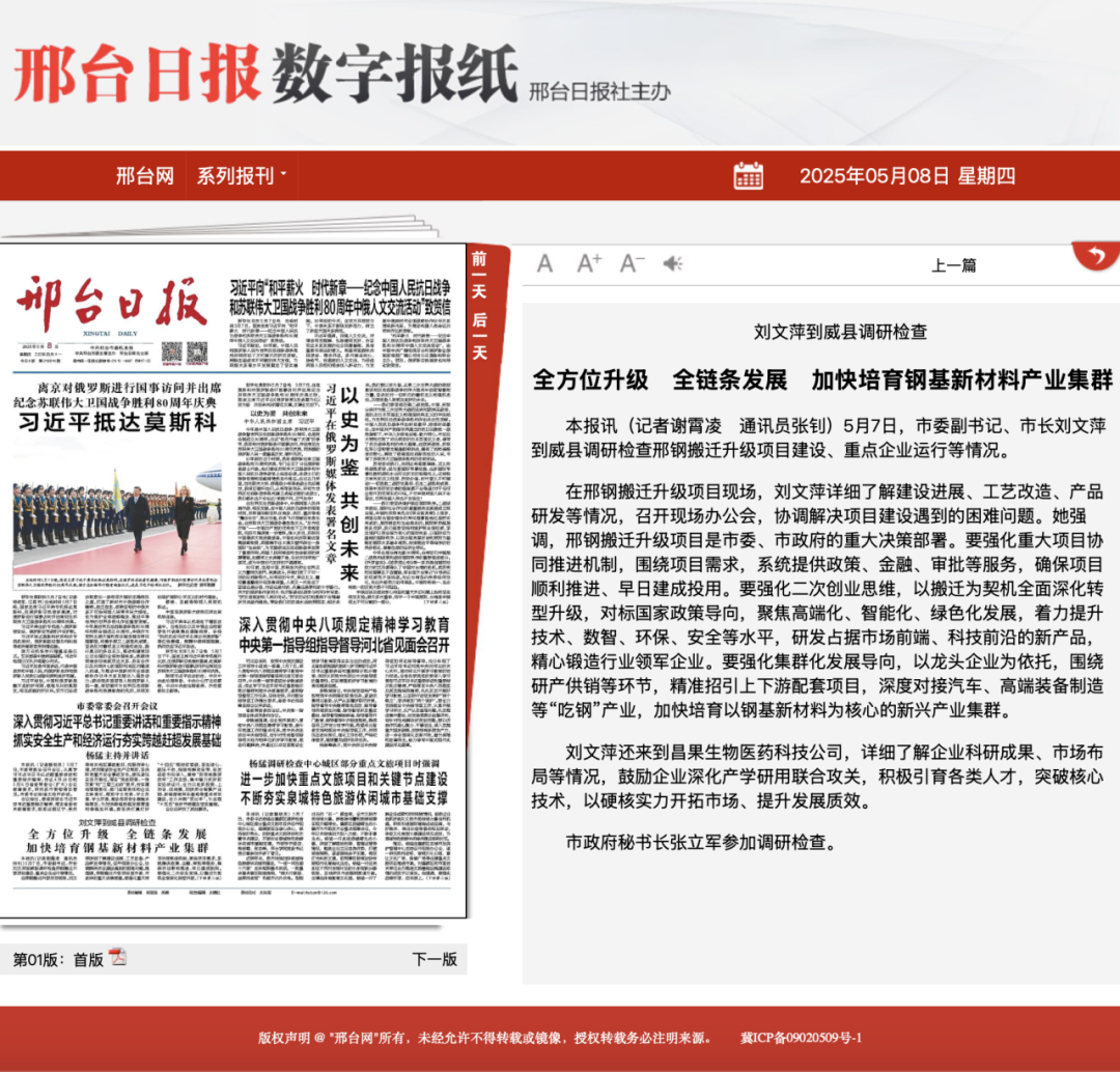 在邢鋼搬遷升級(jí)項(xiàng)目現(xiàn)場(chǎng),劉文萍詳細(xì)了解建設(shè)進(jìn)展、工藝改造、產(chǎn)品研發(fā)等情況,召開(kāi)現(xiàn)場(chǎng)辦公會(huì),協(xié)調(diào)解決項(xiàng)目建設(shè)遇到的困難問(wèn)題。她強(qiáng)調(diào),邢鋼搬遷升級(jí)項(xiàng)目是市委、市政府的重大決策部署。要強(qiáng)化重大項(xiàng)目協(xié)同推進(jìn)機(jī)制,圍繞項(xiàng)目需求,系統(tǒng)提供政策、金融、審批等服務(wù),確保項(xiàng)目順利推進(jìn)、早日建成投用。要強(qiáng)化二次創(chuàng)業(yè)思維,以搬遷為契機(jī)全面深化轉(zhuǎn)型升級(jí),對(duì)標(biāo)國(guó)家政策導(dǎo)向,聚焦高端化、智能化、綠色化發(fā)展,著力提升技術(shù)、數(shù)智、環(huán)保、安全等水平,研發(fā)占據(jù)市場(chǎng)前端、科技前沿的新產(chǎn)品,精心鍛造行業(yè)領(lǐng)軍企業(yè)。要強(qiáng)化集群化發(fā)展導(dǎo)向,以龍頭企業(yè)為依托,圍繞研產(chǎn)供銷(xiāo)等環(huán)節(jié),精準(zhǔn)招引上下游配套項(xiàng)目,深度對(duì)接汽車(chē)、高端裝備制造等“吃鋼”產(chǎn)業(yè),加快培育以鋼基新材料為核心的新興產(chǎn)業(yè)集群。