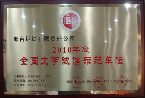 邢鋼榮獲2010年度“全國(guó)文明誠(chéng)信示范單位” 稱號(hào)